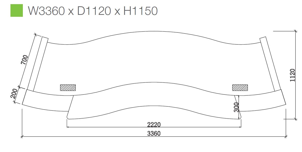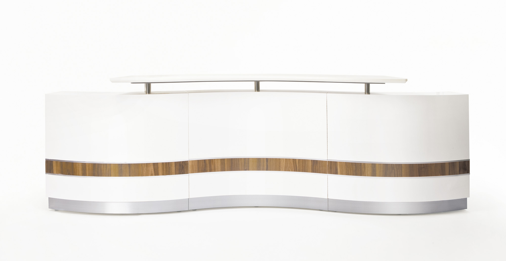 Waved design gives style and elegance to any reception area. Counter body in gloss white with feature gloss teak panel and aluminium strips. Gloss teak desktop, jade white stone hob and stainless steel kick plate.
